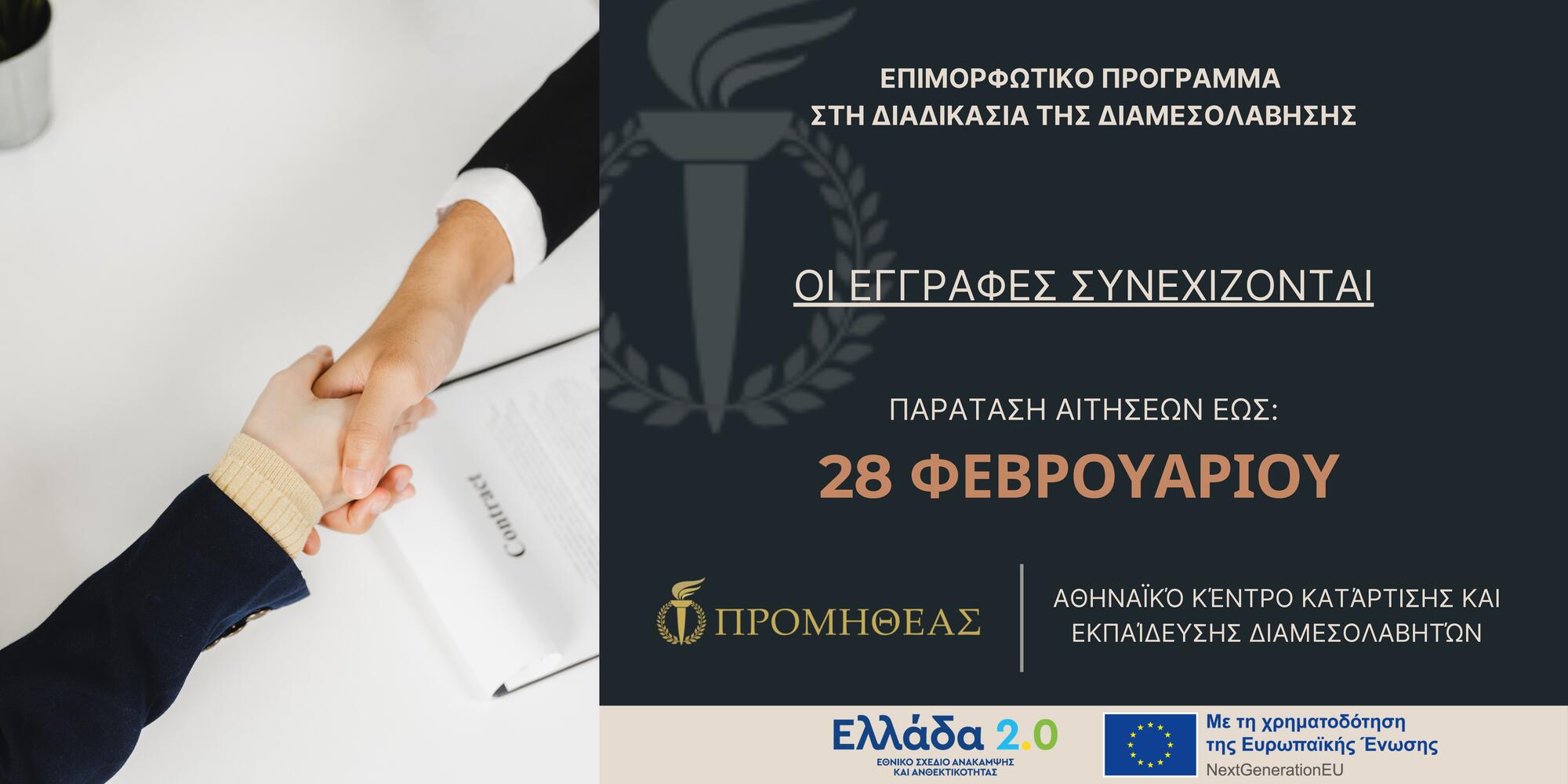Το Αθηναϊκό Κέντρο Κατάρτισης και Εκπαίδευσης Διαμεσολαβητών (Α.Κ.Κ.Ε.Δ.) – «ΠΡΟΜΗΘΕΑΣ» ανακοινώνει νέο Κύκλο Βασικής Εκπαίδευσης Διαμεσολαβητών συνολικής διάρκειας 80 ωρών, σύμφωνα με τα προβλεπόμενα στο Ν. 4640/2019. Οι συμμετέχοντες που θα παρακολουθήσουν το Πρόγραμμα της Βασικής Εκπαίδευσης διάρκειας 80 ωρών και